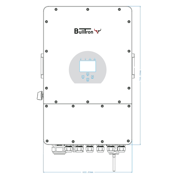 Der Bulltron Hybridwechselrichter ist ein brandneuer dreiphasiger Hybrid-Wechselrichter für Batterien mit einer Spannung 40-60V, der die Sicherheit und Zuverlässigkeit des Systems gewährleistet. Mit kompaktem Design und hoher Leistungsdichte unterstützt diese Serie ein DC/AC-Verhältnis von 1,3, wodurch Investitionen in Geräte gespart werden. Es unterstützt einen dreiphasigen asymmetrischen Ausgang, wodurch die Anwendungsszenarien erweitert werden. Ausgestattet mit 2x CAN-Port (BMS und parallel), 1x RS485-Port für BMS, 1x RS232-Port zur Fernsteuerung, 1x DRM-Port, was das System intelligent und flexibel macht.